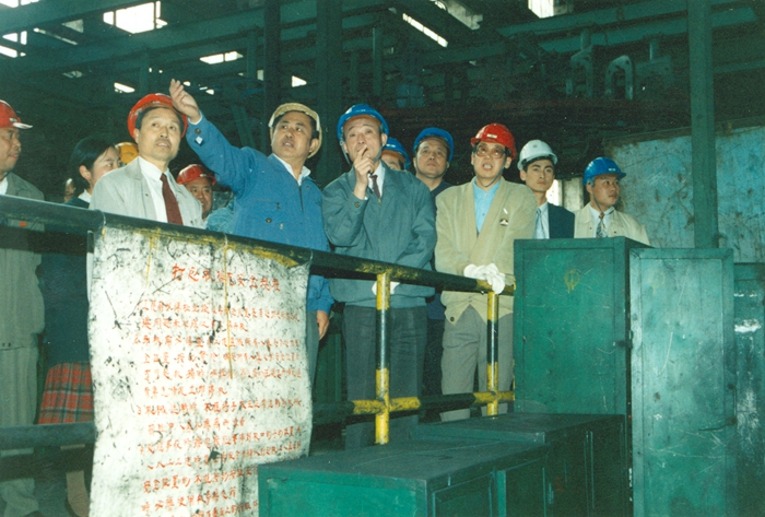 吳邦國副總理在廠區視察時,同第一線工人親切握手、問候。應酒鋼公司領導的邀請,吳邦國在酒鋼簽名留念。