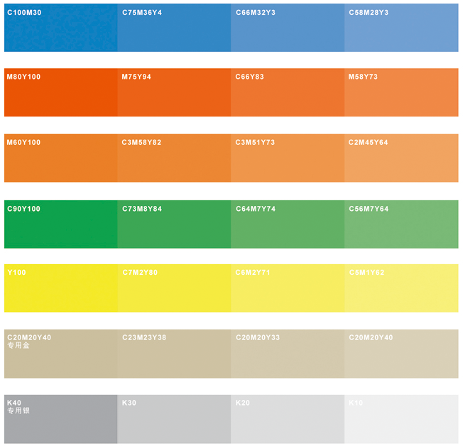 由于載體色彩、加工工藝、使用材質等情況不同,在使用過程中用國際標準色標卡,企業規范統一使用輔助色,適應不同場合和環境的需要,避免在應用中過多使用不符顏色而引起誤導。