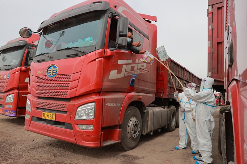 為統籌疫情防控和生產經營,宏興股份公司儲運部對外來貨運車輛采取“不下車、零接觸”的辦法,完成原料檢驗、過泵、卸貨工作,方便貨車司機順利卸車。同時,該部及時了解司機所需,提供車輛維修、代送餐水等便利服務,共同克服疫情帶來的不便。圖為儲運部職工為貨車司機提供暖心的送餐服務。